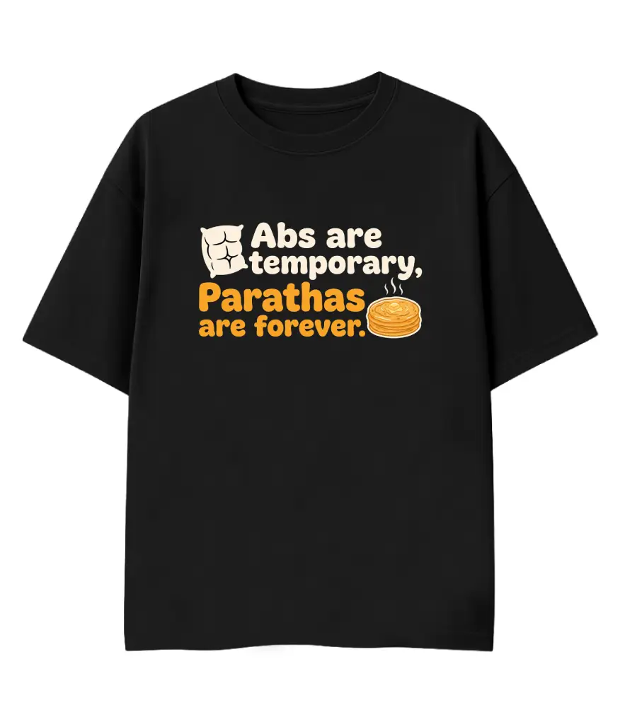 Abs are temporary, butter is eternal. A hilarious foodie statement comparing the fleeting nature of fitness with the everlasting joy of a stack of parathas.