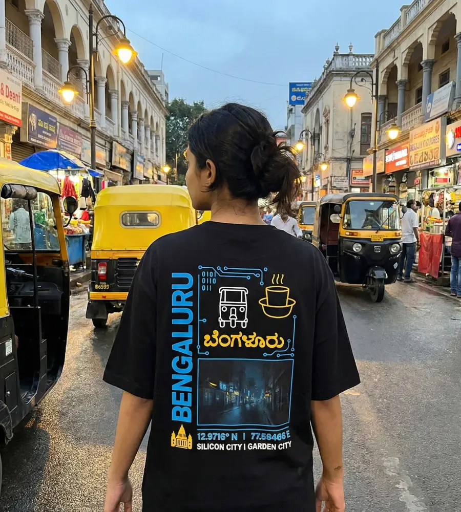 Auto rides, cool weather, and steaming coffee. Wear your city pride with a design that features the coordinates and symbols that make Bengaluru home.