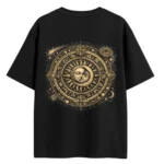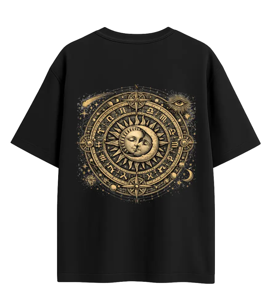 A celestial union of sun and moon surrounded by zodiac symbols—representing balance, time, and destiny.