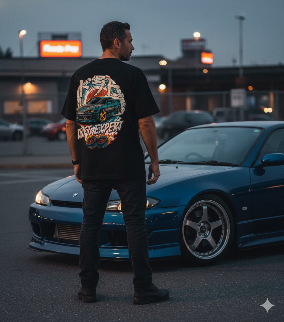 Smoke tires, not engines. This vintage-inspired back-print captures the adrenaline of drift culture with a retro racer, burning wheels, and explosive graphic details.