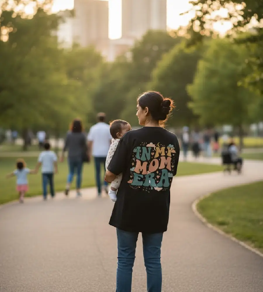 The coolest era yet. A warm, bubbly graphic that trades the chaos of parenting for a moment of retro-cool style.