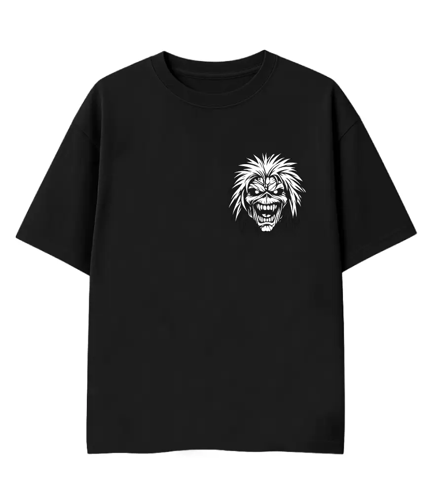 Unleash the beast with this Iron Maiden tee highlighting Eddie and classic anthems like The Trooper in intricate detail. Crafted for true metalheads this oversized shirt delivers a powerful visual statement alongside superior fabric quality.