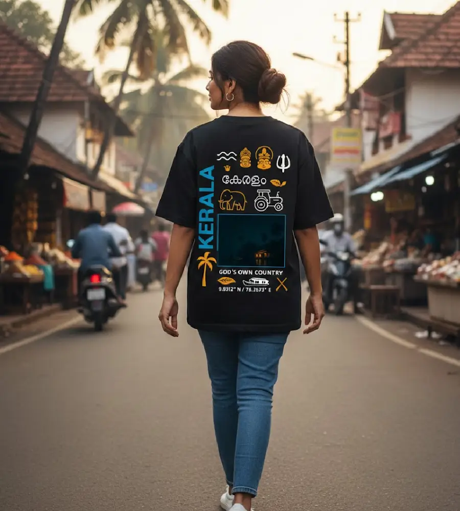 God’s Own Country calling. This vibrant back-print captures the essence of the coast with Kathakali art, houseboats, and the endless shade of coconut trees.