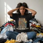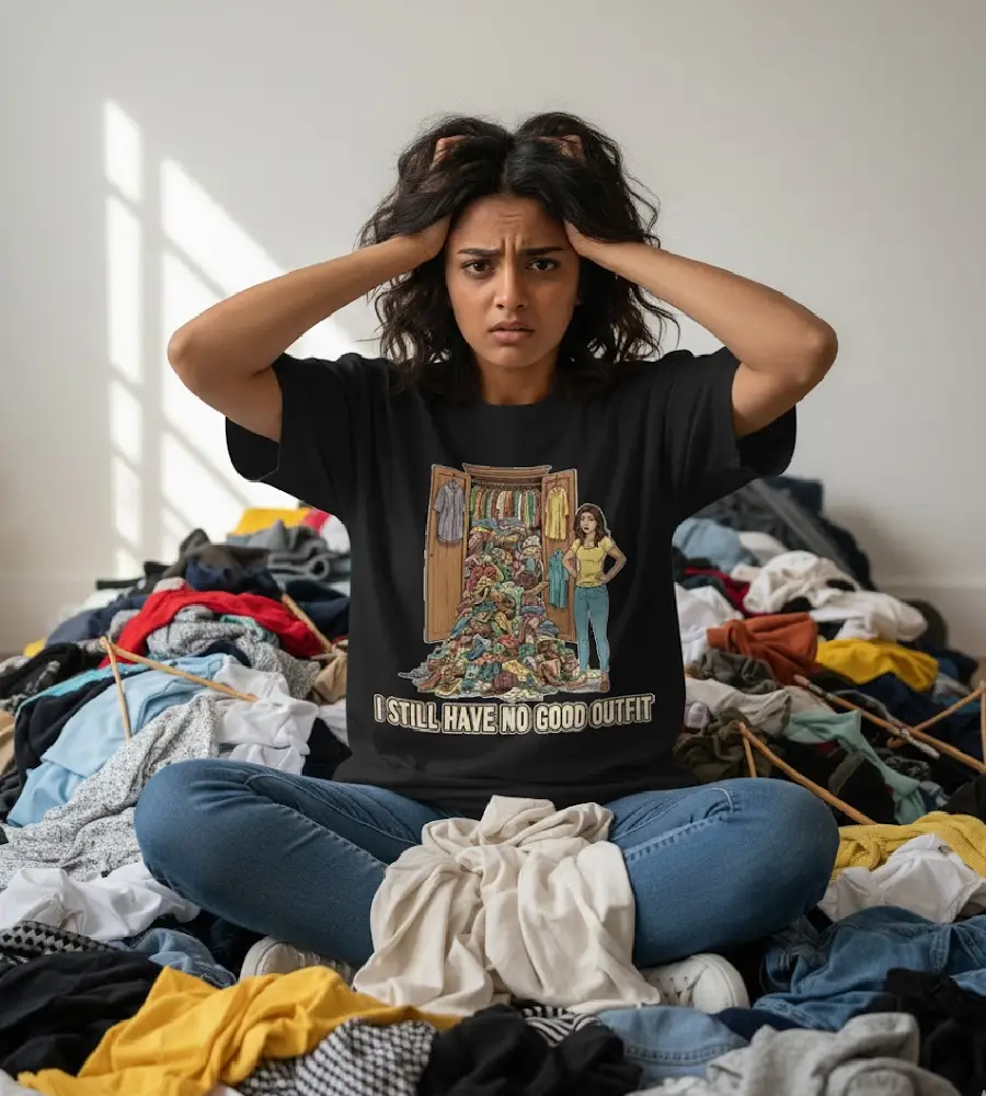 A wardrobe full of clothes, but nothing to wear. This painfully relatable graphic captures the daily struggle of staring at a pile of clothes in despair.