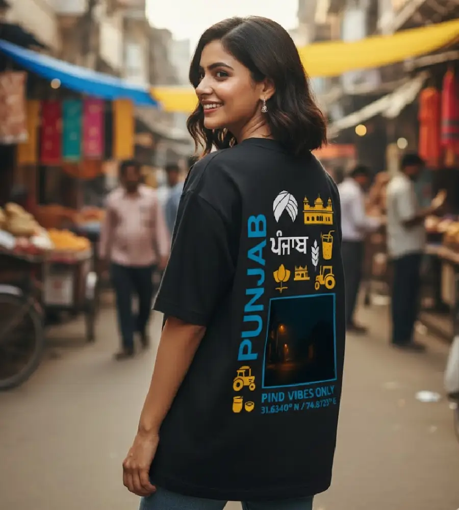 Pind vibes only. This soulful back-print captures the heart of Punjab with iconic symbols—the Golden Temple, tractors, and wheat fields—set against a moody night scene.