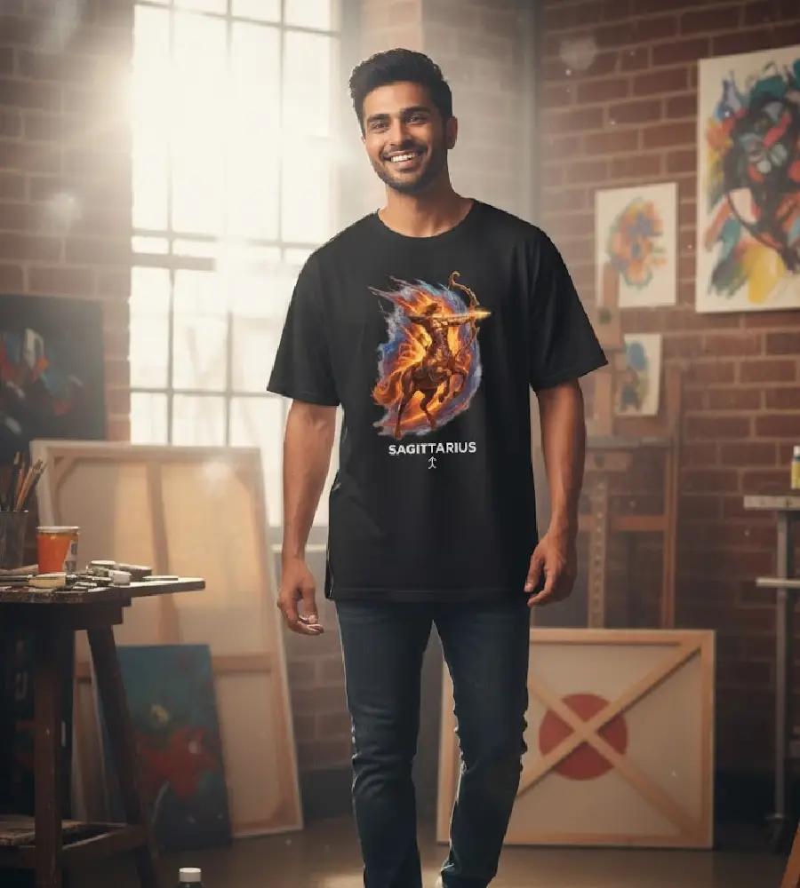 Aim high, burn bright. This epic graphic captures the fiery spirit of the Sagittarius with a mythological centaur archer wreathed in flames.