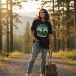 The view is always worth the climb. This scenic badge-style graphic captures the thrill of the summit, featuring a trekker embracing the freedom of the mountains under a crescent moon.